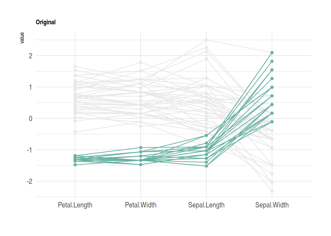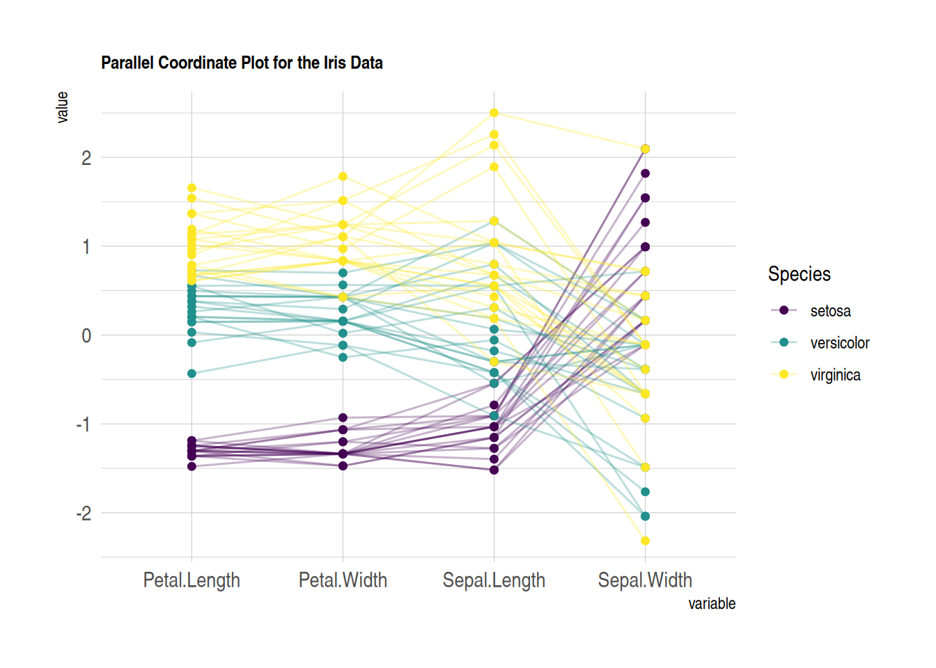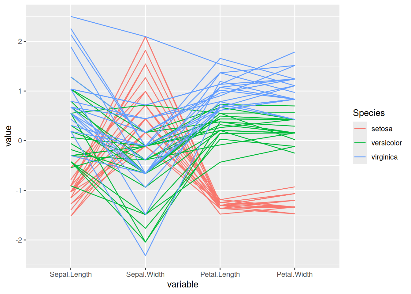 p <- ggparcoord(data_iris, columns = 1:4, groupColumn = 5)