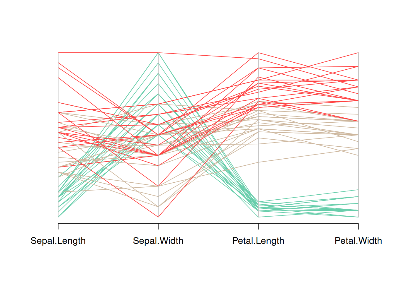 parcoord(data_iris[, c(1:4)], col = my_colors)