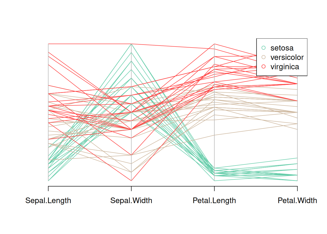 这些图用颜色区分不同的花种,线条表示每个样本在不同变量上的值。