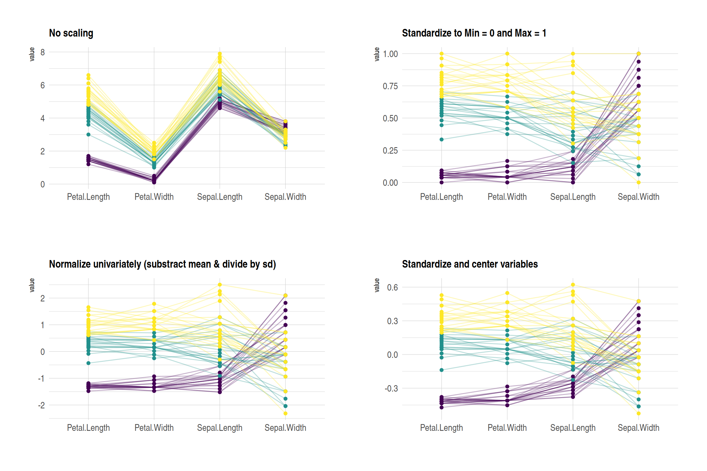 - 无标准化 (No scaling):展示原始数据,每个变量保留其原始范围,数值范围差异较大的变量更显著。