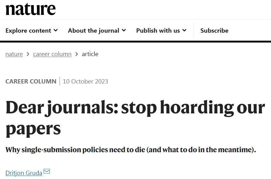 国际顶级期刊Nature 职业专栏(Nature Career Column)发表文章指出禁止“一稿多投”不仅延误了科研工作的进程,还阻碍了科学信息的快速传播,学术期刊不应利用这项不合理的政策囤积投稿,“是时候废除‘一稿多投’禁令了。”