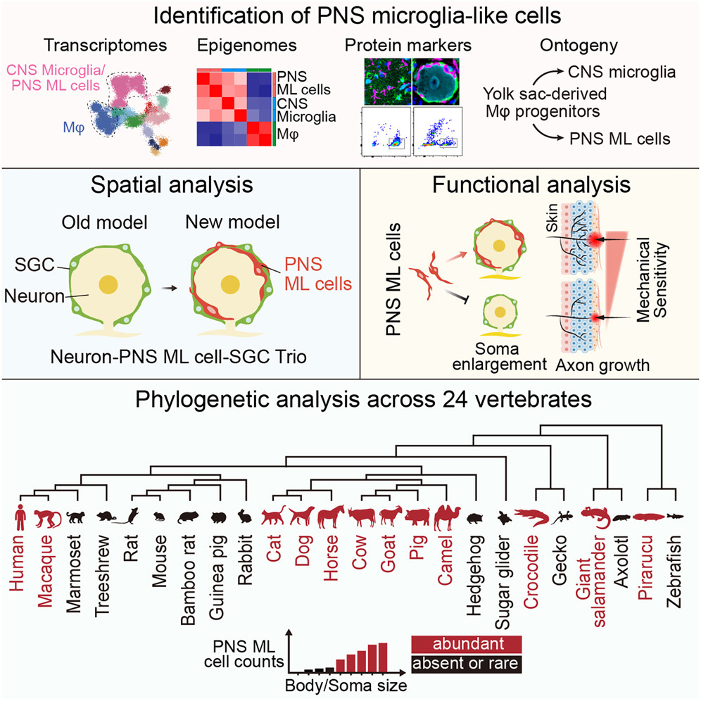 该研究通过跨物种、高时空分辨率的单细胞转录组测序技术,结合多组学分析手段,首次在外周神经系统中发现了一群与中枢神经系统小胶质细胞具有相同分子特征、且与物种体型大小相关的小胶质细胞,并将其命名为PNS microglia。
