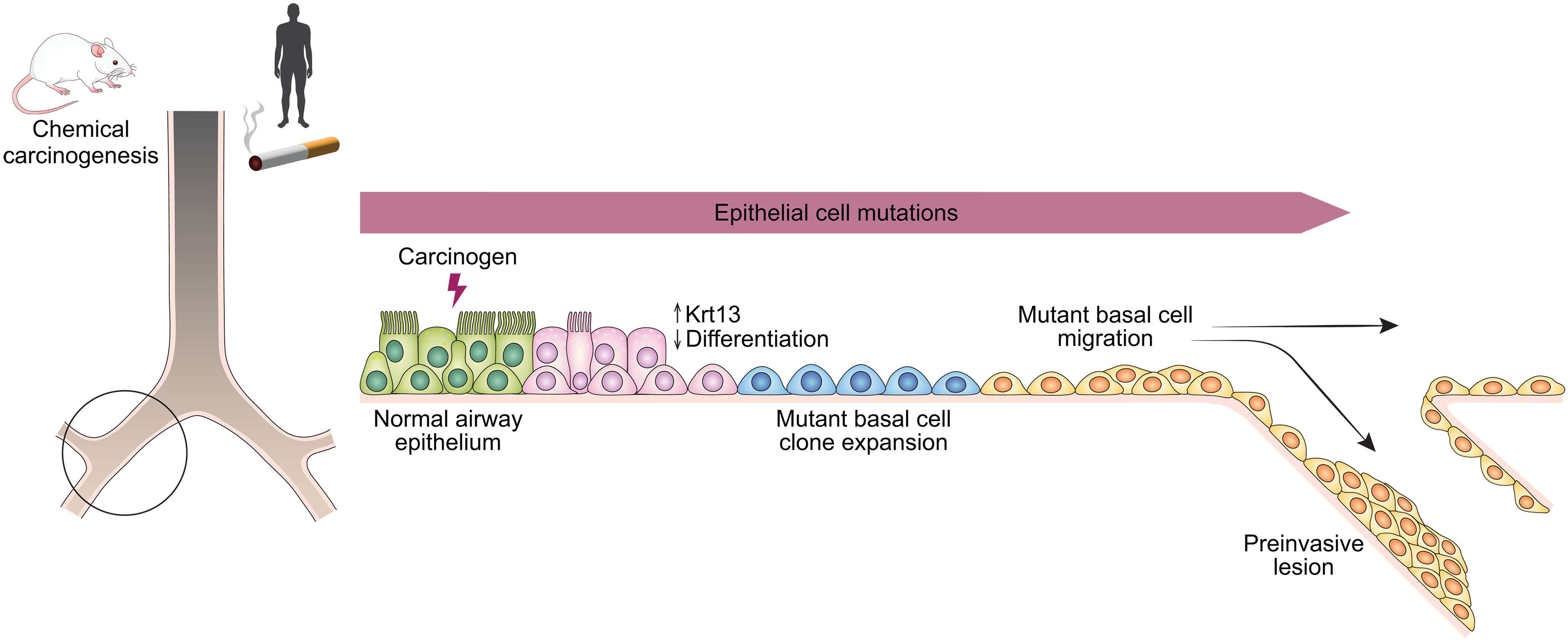 基底细胞是气道上皮的主要组成部分,且其标志物如KRT5和p63在LUSC中广泛表达,因此被认为可能是LUSC的起源细胞。研究发现,致癌物暴露导致肺基底细胞发生异常的克隆扩增和迁移,少数高度突变的克隆在支气管区域主导并形成癌前病变。通过多点测序,验证了这些病变之间的克隆相关性,揭示了基底细胞克隆动态和命运转变是肺部“癌变场域效应”的关键驱动因素。