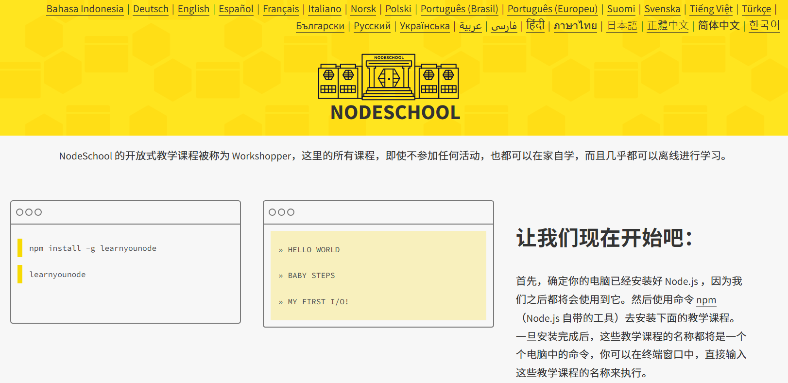 一个基于Node.js的开放式技术学习平台。它提供了一系列交互式命令行教程作为核心学习资源。这些资源覆盖了从JavaScript、Node.js基础到Git、npm、Electron等全栈开发的系统化课程,所有课程均可通过npm命令免费安装并支持离线学习。